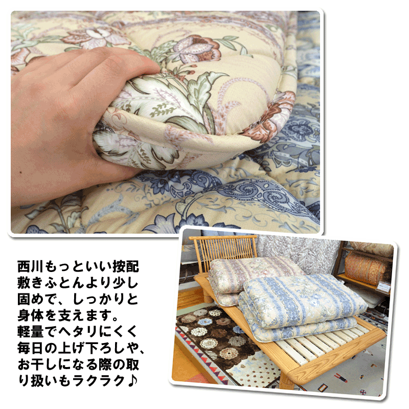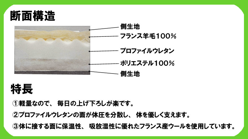 サイズ シングルロングサイズ(100×210) 商品説明 上層:毛100% 0.75kg 中層:ウレタンフォーム1.60kg 下層:ポリエステル100% 0.75kg 表面は凸凹形状で適度に体圧分散し、身体に負担をかけません。